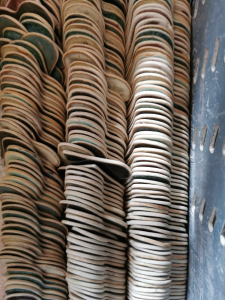 Once dried, between two pieces of plasterboard, they are fired in the electric kiln. After a couple of days, we can empty the kiln, sand any rough spots and then they are glazed, with one of our eight stoneware glazes and fired again, each one laid out carefully on the shelves. The kiln is fired again and then comes the next stage..