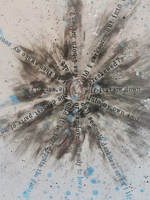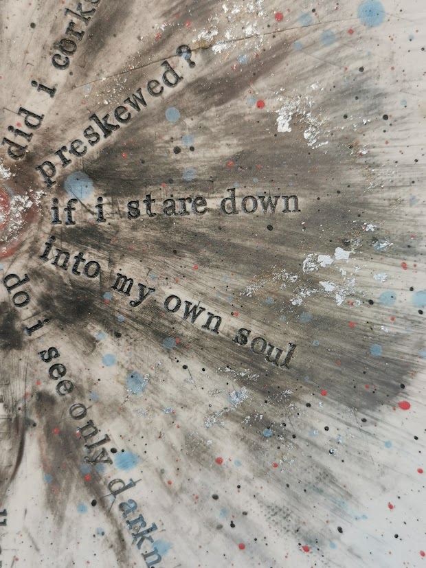 The poem, or lines from a poem, are chosen first – even though it may only be a part of a poem, you can be assured that it was created with feeling. The words are stamped in letter by letter into the clay tile which was cut from a slab of soft stoneware clay and dried a little. The sketch is then etched into the clay – Michaela loves to doodle, and lets her imagination go with what the words have inspired, putting in the lines, textures and some colour, before placing the tile between plasterboard sheets to keep it flat while drying.
