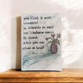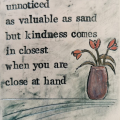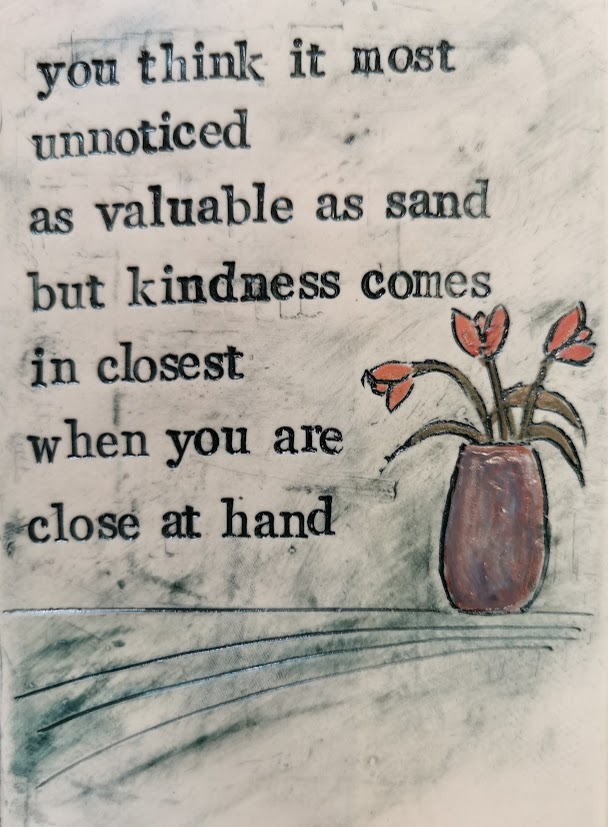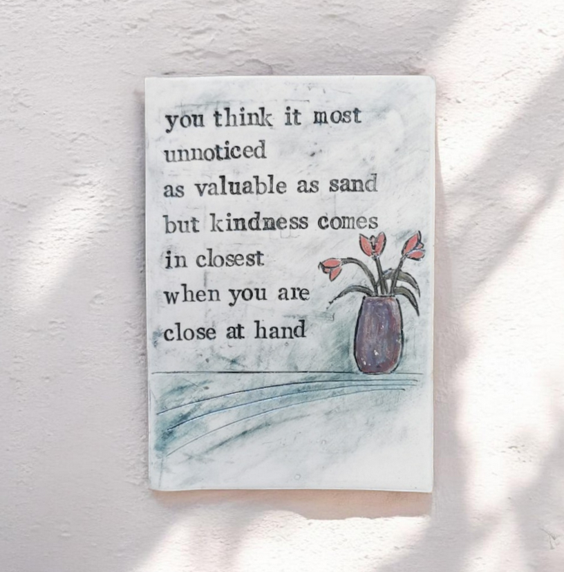 These ‘poetry plaques’ are simple, postcard size ceramic artworks, each with a few lines from Chris’s poetry, highlighted by a sketch and some colour. This one reads, ‘you think it goes unnoticed, as valuable as sand, but kindness comes in closest when you are close at hand’, symbolised by a vase and flowers – the way we often reach out.