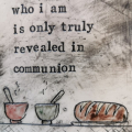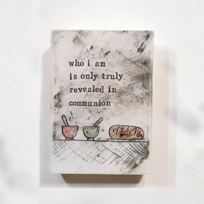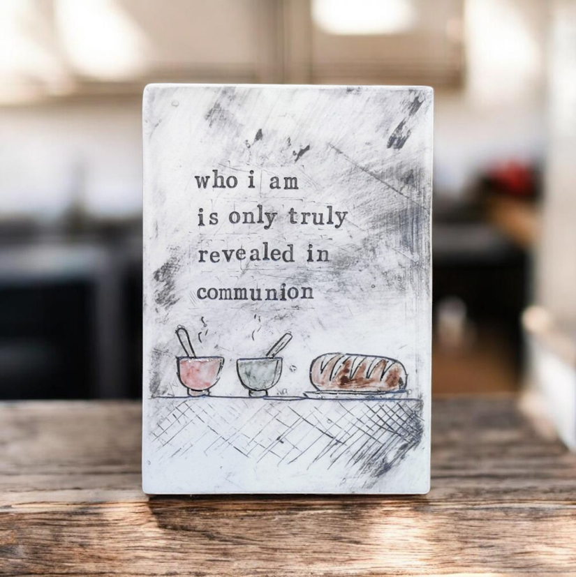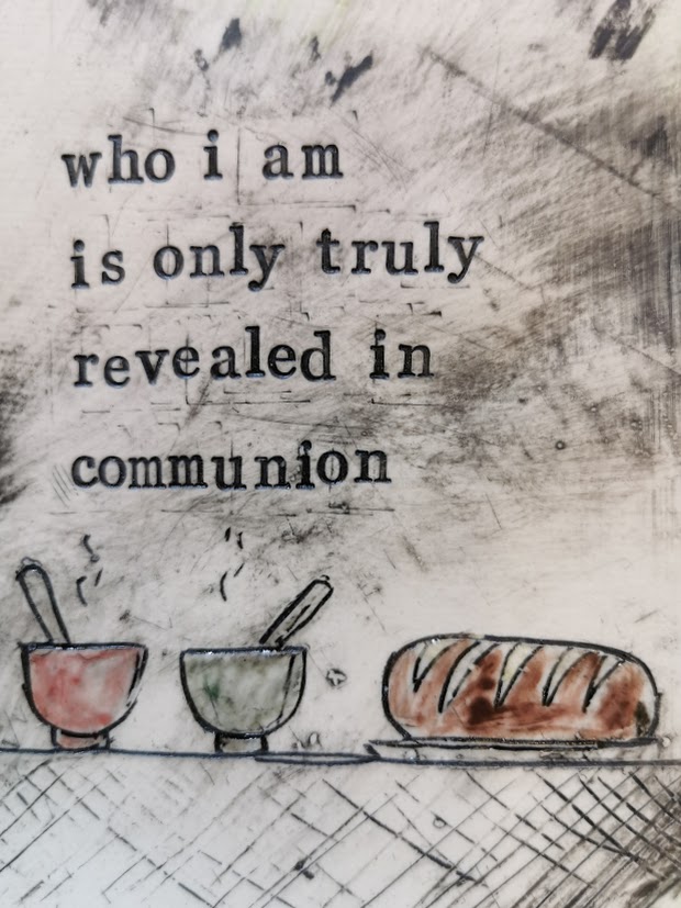 These ‘poetry plaques’ are simple, postcard size ceramic artworks, each with a few lines from Chris’s poetry, highlighted by a sketch and some colour. This one reads, ‘who I am is only truly revealed in communion’ symbolised by a shared table of bread and soup.